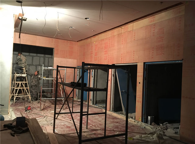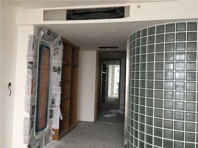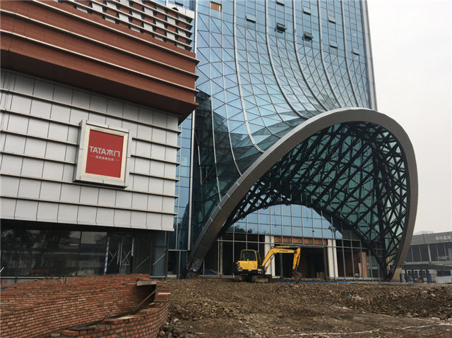 3、酒店:客房?jì)裙文佔油瓿?,墻面裝飾基層施工完畢,衛生間墻地磚、玻璃隔斷施工完畢。外立面幕墻、主入口雨篷施工全部完成。