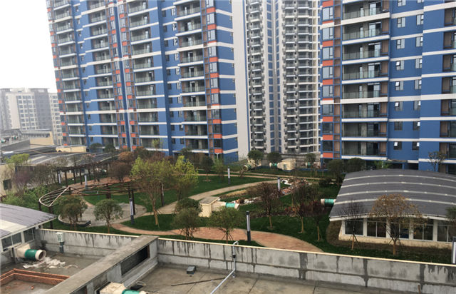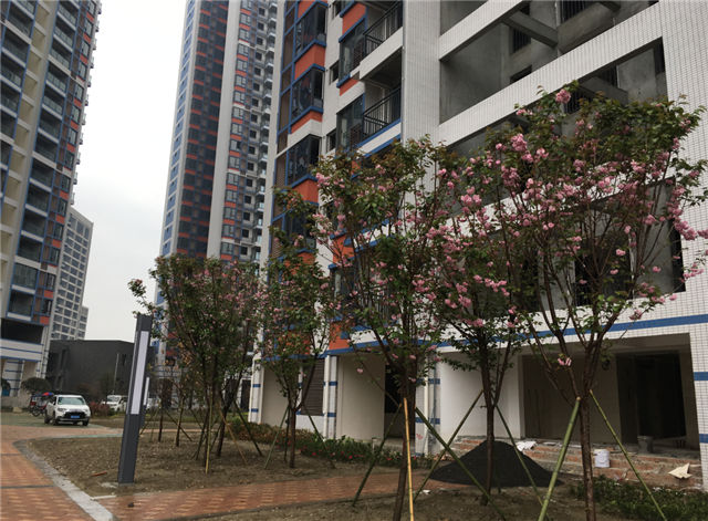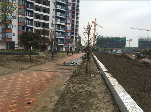 6、室外附屬:小區內人行道區域面層粘貼全部完成,喬木、灌木已種植,綠化帶內正在種植綠籬。小區外圍正在做面層鋪貼施工。